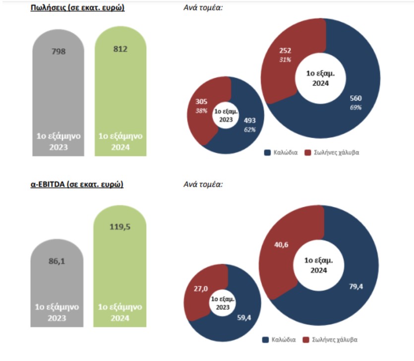 Οι πωλήσεις αυξήθηκαν ελαφρώς και ανήλθαν σε 812 εκατ. ευρώ, με το β΄ τρίμηνο του 2024 να βρίσκεται στα ίδια επίπεδα με το β΄ τρίμηνο του 2023. Η αύξηση οφείλεται στις μεγαλύτερες πωλήσεις από τα έργα καλωδίων (+104 εκατ. ευρώ έναντι του α΄ εξαμήνου 2023 ή 70,5% σε ετήσια βάση), που κάλυψαν την όποια μείωση από πωλήσεις σε καλώδια ενέργειας και τηλεπικοινωνιών και από πωλήσεις σωλήνων χάλυβα.