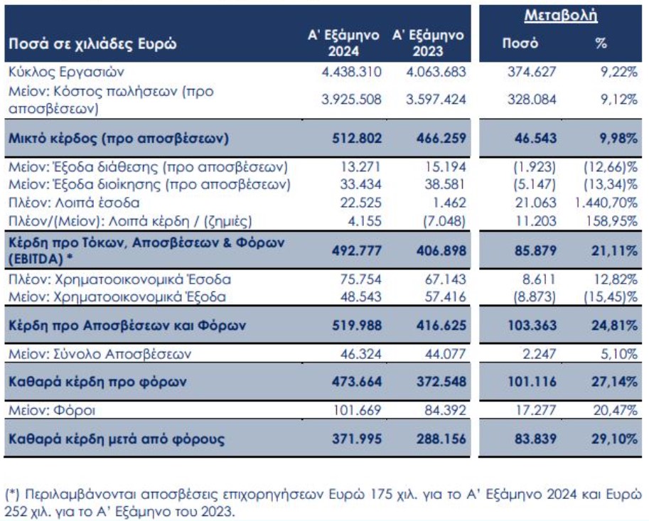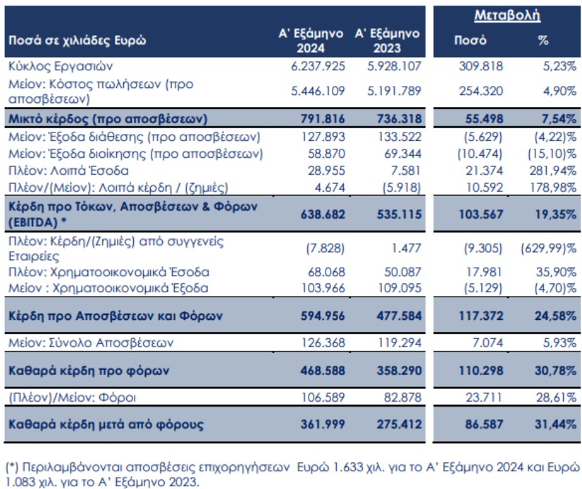 Επίσης τα οικονομικά μεγέθη της Εταιρείας κατά το Α’ Εξάμηνο του 2024 σε σύγκριση με το αντίστοιχο Εξάμηνο του 2023, κινήθηκαν ως εξής: