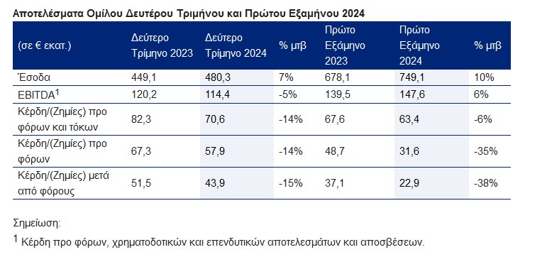 Ο ενοποιημένος κύκλος εργασιών για το Β’ Τρίμηνο ανήλθε σε €480,3 εκατ., αυξημένος κατά 7% σε σχέση με την ίδια περίοδο του 2023, με το ΕΒΙΤDA να διαμορφώνεται στα €114,4 εκατ. από €120,2 εκατ. το Β’ Τρίμηνο του 2023, και το τελικό αποτέλεσμα να διαμορφώνεται σε κέρδη μετά από φόρους για το Β’ Τρίμηνο του 2024 ύψους €43,9 εκατ. από €51,5 εκατ. το Β’ Τρίμηνο του 2023.