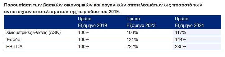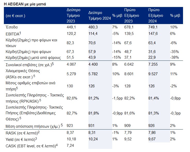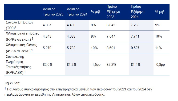 Συνολικά κατά το Α’ Εξάμηνο του έτους η AEGEAN μετέφερε 7,3 εκατ. επιβάτες, 9% περισσότερους συγκριτικά με το Εξάμηνο του 2023, προσφέροντας 9,5 δις. χιλιομετρικές θέσεις, 11% περισσότερες θέσεις σε σχέση την ίδια περίοδο του 2023. Ο συντελεστής πληρότητας διαμορφώθηκε στο 81,4% το Α’ Εξάμηνο του 2024.