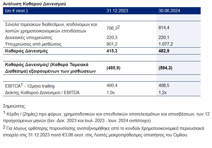 Λόγω των ισχυρών θετικών ταμειακών ροών από την λειτουργική κερδοφορία αλλά και τις προπωλήσεις εισιτήριων της καλοκαιρινής περιόδου, τα ταμειακά αποθέματα και τα άμεσα ρευστοποιήσιμα χρηματοοικονομικά στοιχεία αυξήθηκαν σε €814,4 εκατ. στις 30.06.2024 από €706,3 εκατ. στις 31.12.2023, πάρα την εξαγορά των Warrants με την καταβολή €85,4 εκατ. στην Ελληνική Δημοκρατία την 02.01.2024 αλλά και την πρώτη μετά από μία τετραετία, καταβολή μερίσματος ύψους €67,6 εκατ. στους μέτοχους στις 27.05.2024.