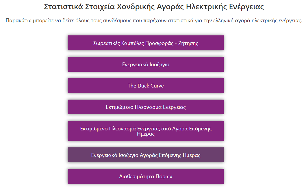 «Παρακολούθηση Αγορών» à στη συνέχεια επιλέγουμε «Ελληνική Αγορά Χονδρικής Ηλεκτρικής Ενέργειας» και εν συνεχεία à «Στατιστικά Στοιχεία Χονδρικής Αγοράς Ηλεκτρικής Ενέργειας»