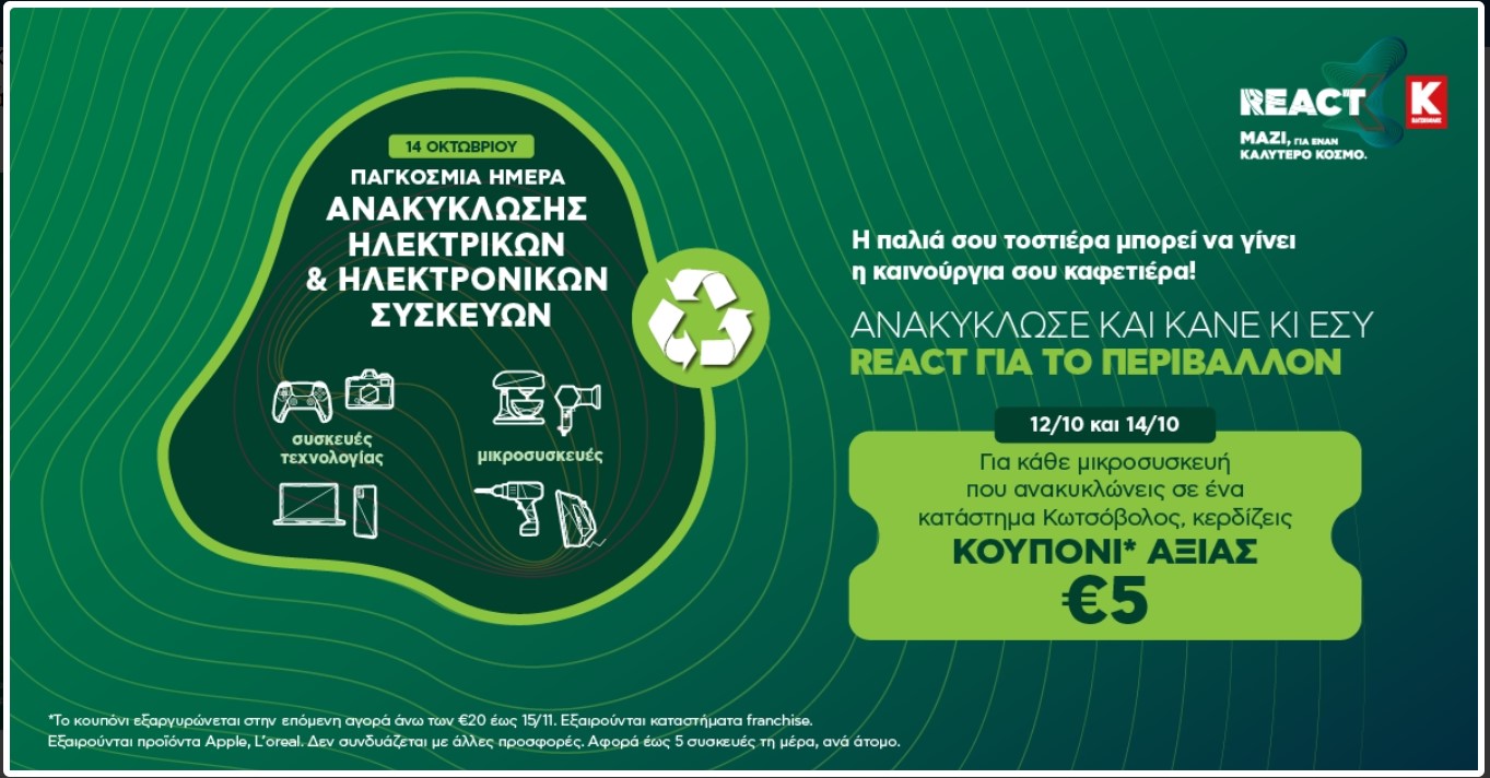 Για κάθε μικροσυσκευή* που θα παραδίδεται στα ειδικά σημεία ανακύκλωσης στα καταστήματα Κωτσόβολος, οι καταναλωτές θα λαμβάνουν ένα κουπόνι αξίας 5€. Το κουπόνι αυτό θα μπορεί να εξαργυρωθεί σε επόμενη αγορά, αξίας άνω των 20€, επιβραβεύοντας την πράξη τους που συμβάλλει σε ένα βιώσιμο μέλλον.