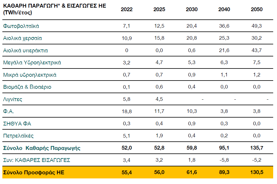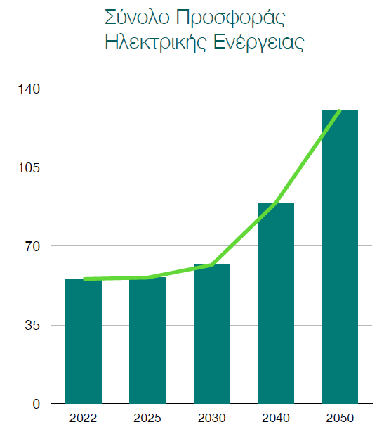 Παράλληλα, η αύξηση του ρόλου των ΑΠΕ θα συνοδεύεται από μία αντίστοιχη αύξηση στην παραγωγή ηλεκτρικού ρεύματος, καθώς το νέο ΕΣΕΚ προβλέπει σχεδόν τριπλασιασμό, από τις 56,4 TWh το 2025 στις 130,3 TWh το 2050.
