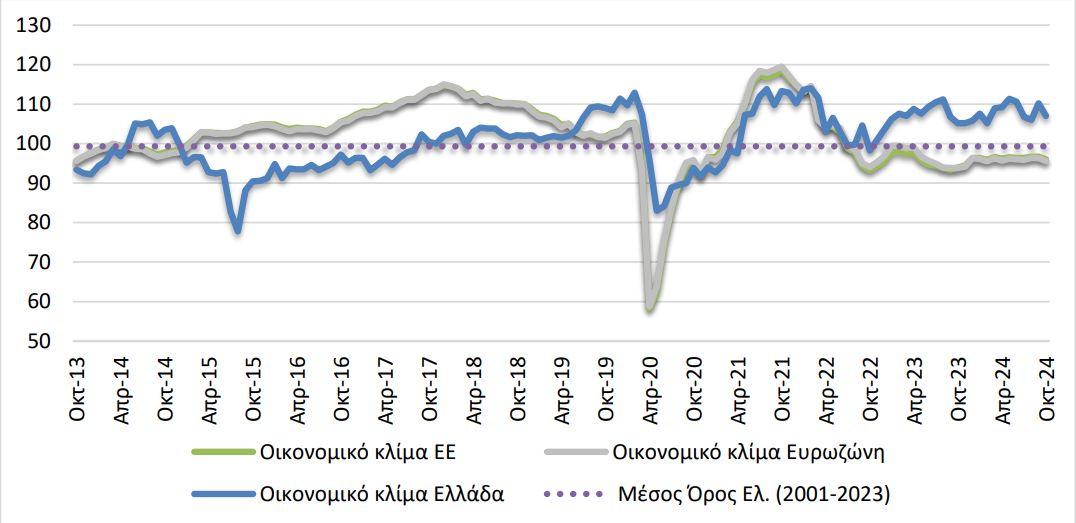 Η εξέλιξη το οικονομικού κλίματος σε ΕΕ και Ελλάδα. Πηγή: ΙΟΒΕ.