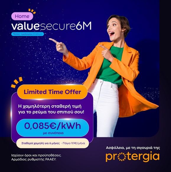 Έτσι, προσφέρει και τον Δεκέμβριο το οικιακό «μπλε» τιμολόγιο Value Secure 6M Limited offer με την χαμηλότερη τιμή της αγοράς, στα €85 / MWh.