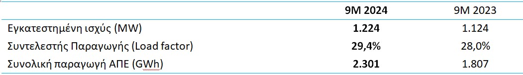 Όσον αφορά στο συντελεστή φόρτισης (load factor), αυτός διαμορφώθηκε σε 29,4% για το σύνολο του χαρτοφυλακίου, έναντι 28,0% για την αντίστοιχη περίοδο του 2023, ενώ συγκεκριμένα για την Ελλάδα διαμορφώθηκε σε 29,8% έναντι 28,7%. Σε συνδυασμό με την αυξημένη εγκατεστημένη ισχύ, η παραγωγή ενέργειας αυξήθηκε κατά 27,3% και ανήλθε στις 2.301GWh. Σημειώνεται ότι εξαιρώντας το έργο του Καφηρέα, η παραγωγή ενέργειας αυξήθηκε κατά 2,8%.