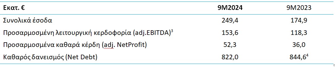 Η καθαρή δανειακή θέση (δανειακές υποχρεώσεις μείον ταμειακά διαθέσιμα, μείον δεσμευμένες καταθέσεις σχετιζόμενες με δανειακές υποχρεώσεις) διαμορφώθηκε στο τέλος του Εννεάμηνουστο επίπεδο των € 822 εκατ. (μη συμπεριλαμβανομένου ποσού € 35,4 εκατ. σχετιζόμενου με δραστηριότητες και περιουσιακά στοιχεία προς πώληση) έναντι € 844,6 εκατ. στο τέλος του 2023.