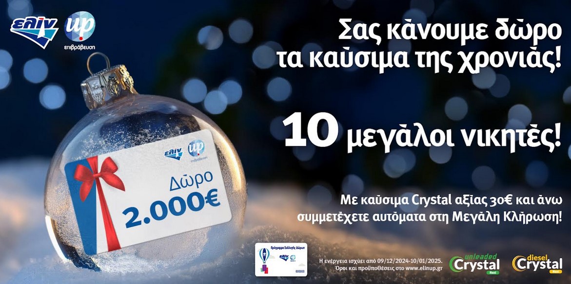 Από τις 09/12/2024 έως και 10/01/2025, με αγορές των πρωτοποριακών καυσίμων Crystal Next αξίας 30€ και άνω, συμμετέχετε αυτόματα στην κλήρωση που θα αναδείξει 10 μεγάλους τυχερούς!