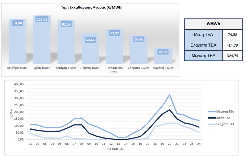 σε ποσοστιαία βάση κατά 26,15%από τη μέση ΤΕΑ της αμέσως προηγούμενης εβδομάδας, με τη μέγιστη και την ελάχιστη ΤΕΑ να διαμορφώνονται στα €324,79/MWh και στα -€14,79/MWh αντιστοίχως. Αξίζει να αναφερθεί ότι η μεγαλύτερη μέση ΤΕΑ ανά ημέρα της προηγούμενης εβδομάδας επετεύχθη την περασμένη Τρίτη (16/9) φτάνοντας τα €102,71/MWh.