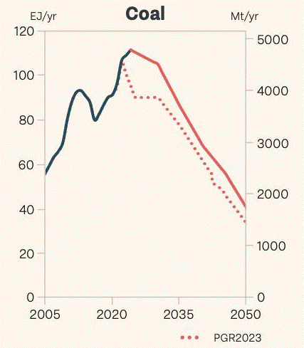 Μάλιστα, αυτή η ανοδική αναθεώρηση των εκτιμήσεων οφείλεται σε σημαντικό βαθμό σε έναν μόνο παράγοντα: τον κινεζικό άνθρακα. Η στενότητα στην αγορά ηλεκτρικής ενέργειας τα τελευταία χρόνια έχει οδηγήσει την κυβέρνηση της Κίνας να δώσει μεγάλη ώθηση στην ανάπτυξη μονάδων παραγωγής ενέργειας με καύση άνθρακα και ορυχείων για την προμήθειά τους. Έτσι, αν και η πρόβλεψη ότι η κινεζική παραγωγή άνθρακα θα εμφανίσει απότομη πτώση εξακολουθεί να ισχύει, αυτό, τελικά, αναμένεται να συμβεί αργότερα και από υψηλότερο επίπεδο από ό,τι είχε προβλεφθεί το 2023 (αυτή η προηγούμενη επίσημη πρόβλεψη φαίνεται από την διακεκομμένη κόκκινη γραμμή στο παρακάτω διάγραμμα):