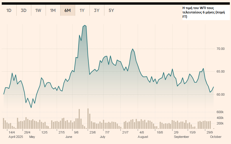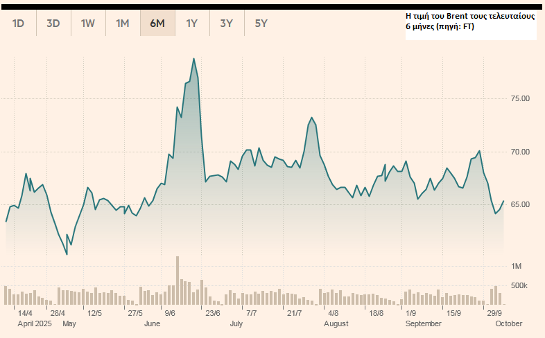 Οι τιμές του Brent υποχώρησαν κάτω από τα 65 δολάρια ανά βαρέλι την Παρασκευή, καθώς οι περισσότεροι αναλυτές προβλέπουν υπερπροσφορά στο τέταρτο τρίμηνο και το 2026 λόγω της χαμηλότερης ζήτησης και της αυξανόμενης προσφοράς στις ΗΠΑ. Οι τιμές διαπραγματεύονταν την Παρασκευή κάτω από τα φετινά υψηλά των 82 δολαρίων ανά βαρέλι, αλλά πάνω από τα 60 δολάρια ανά βαρέλι που παρατηρήθηκαν τον Μάιο.