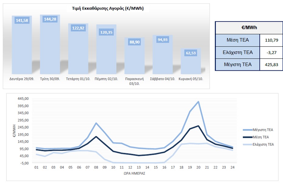 29 Σεπτεμβρίου και 5 Οκτωβρίου 2025 ανήλθε στα €110,79/MWh, δηλαδή αυξημένη σε ποσοστιαία βάση κατά18,87% από τη μέση ΤΕΑ της αμέσως προηγούμενης εβδομάδας, με τη μέγιστη και την ελάχιστη ΤΕΑ να διαμορφώνονται στα €425,83/MWh και στα -€3,27/MWh αντιστοίχως. Αξίζει να αναφερθεί ότι η μεγαλύτερη μέση ΤΕΑ ανά ημέρα της προηγούμενης εβδομάδας επετεύχθη την περασμένη Τρίτη (30/9) φτάνοντας τα €144,28/MWh.