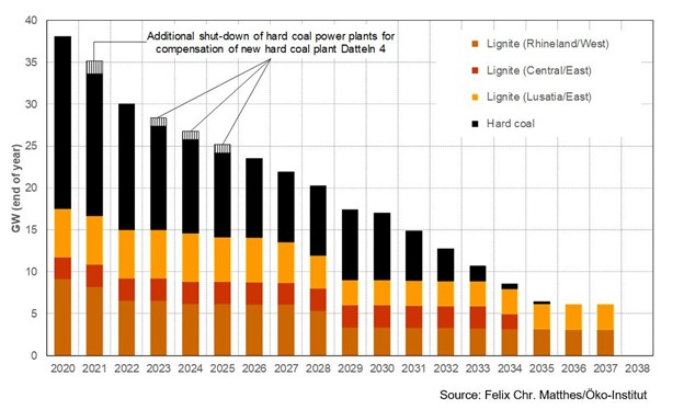 Εικόνα 1. Το πρόγραμμα σταδιακής απολιγνιτοποίησης στη Γερμανία με κλιμακούμενη μείωση μέχρι το 2038 ( Clean Energy Wire: Spelling out the coal exit – Germany’s phase-out plan, 2020)