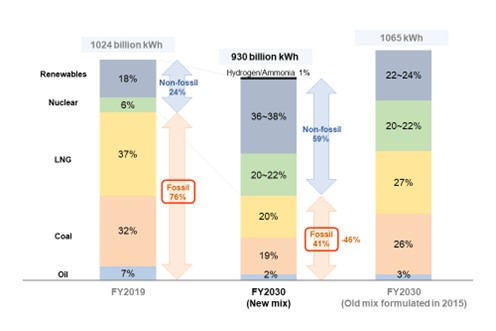 Εικόνα 2. Το ενεργειακό μείγμα της Ιαπωνίας το 2019, αρχική πρόβλεψη για το 2030 δεξιά με 26% άνθρακα και αναθεώρηση με 19% άνθρακα. Σημειώνεται η σημαντική επαύξηση της πυρηνικής ενέργειας. Ενεργειακό μείγμα, εκ των κάτω προς τα άνω: πετρέλαιο, άνθρακας, LNG, πυρηνική ενέργεια, ΑΠΕ.