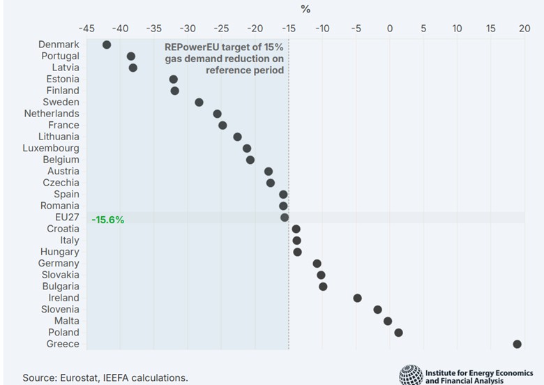 Στο πλαίσιο του σχεδίου REPowerEU, τα κράτη μέλη της ΕΕ συμφώνησαν με τις προτάσεις της Ευρωπαϊκής Επιτροπής για εθελοντική μείωση της χρήσης φυσικού αερίου. Συγκεκριμένα τα κράτη μέλη ενθαρρύνθηκαν να μειώσουν την κατανάλωση φυσικού αερίου από τον Απρίλιο του 2024 έως τον Μάρτιο του 2025 κατά τουλάχιστον 15% σε σύγκριση με τη μέση ετήσια κατανάλωσή τους με περίοδο αναφοράς μεταξύ Απριλίου 2017 και Μαρτίου 2022. Ο στόχος ξεπεράστηκε, καθώς η ΕΕ μείωσε την κατανάλωση φυσικού αερίου κατά 15,6%. Ενώ τα περισσότερα κράτη μέλη της ΕΕ ξεπέρασαν τον στόχο 2024-25, ορισμένα δεν τον πέτυχαν. Η Ελλάδα και η Πολωνία μάλιστα αύξησαν την κατανάλωση. Ειδικότερα η Ελλάδα αύξησε την κατανάλωση κατά 18,9% (Εικόνα 3).
