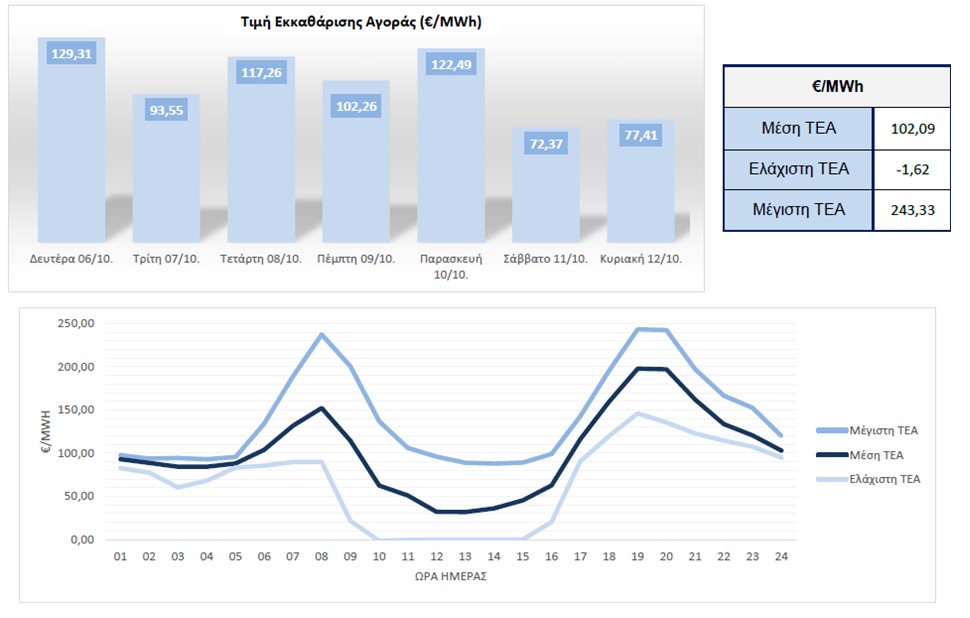 μέση ΤΕΑ της αμέσως προηγούμενης εβδομάδας, με τη μέγιστη και την ελάχιστη ΤΕΑ να διαμορφώνονται στα €243,33/MWh και στα -€1,62/MWh αντιστοίχως. Αξίζει να αναφερθεί ότι η μεγαλύτερη μέση ΤΕΑ ανά ημέρα της προηγούμενης εβδομάδας επετεύχθη την περασμένη Δευτέρα (6/10) φτάνοντας τα €129,31/MWh.