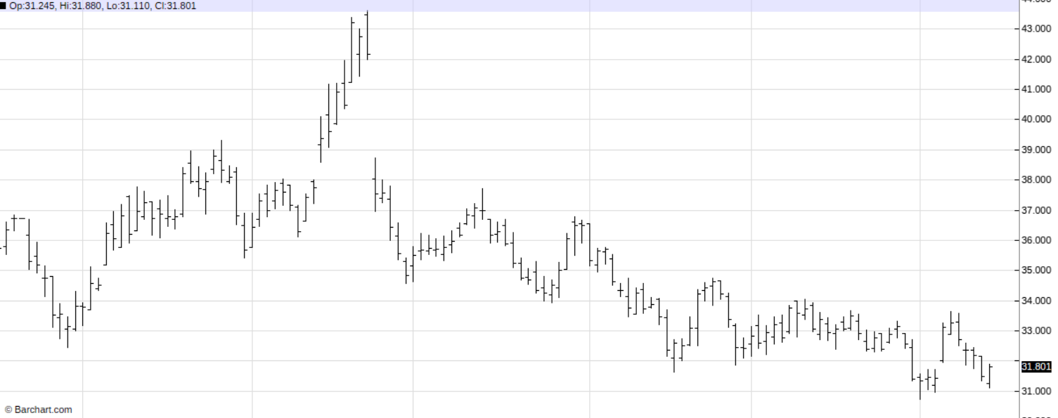 (Διακύμανση τιμών φυσικού αερίου, τελευταίων έξι μηνών, στο TTF. Πηγή: Barchart.com)