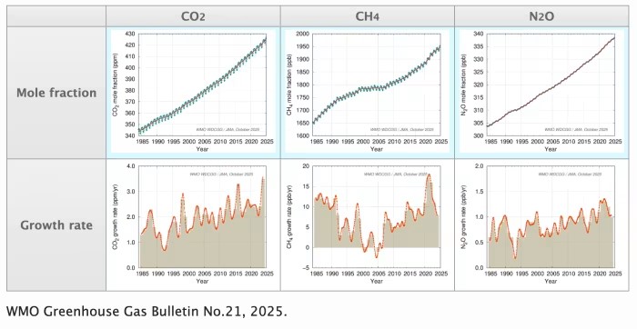 Ο Παγκόσμιος Οργανισμός Μετεωρολογίας (WMO) δημοσιεύει ετήσια Δελτία Αερίων του Θερμοκηπίου, στα οποία αναφέρονται τα επίπεδα συγκέντρωσης στην ατμόσφαιρα και οι ρυθμοί ανάπτυξης των κύριων μακρόβιων αερίων: διοξείδιο του άνθρακα (CO₂), μεθάνιο (CH₄) και υποξείδιο του αζώτου (N₂O).