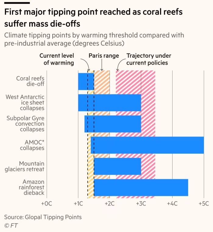 Αυτό συνδυάστηκε με μια ξεχωριστή μελέτη με επικεφαλής το Πανεπιστήμιο του Έξετερ, η οποία υποδεικνύει παραβίαση του πρώτου λεγόμενου σημείου καμπής για το κλίμα, καθώς οι κοραλλιογενείς ύφαλοι θερμών υδάτων βίωσαν «άνευ προηγουμένου θνησιμότητα» μετά από επαναλαμβανόμενα μαζικά γεγονότα λεύκανσης κατά τη διάρκεια διαδοχικών καυσώνων στον ωκεανό.