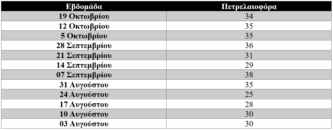 του Bloomberg, οι θαλάσσιες εξαγωγές κατά την εβδομάδα μέχρι τις 19 Οκτωβρίου έφτασαν τα 3,82 εκατομμύρια βαρέλια την ημέρα, αυξημένα κατά 2% σε σχέση με την εβδομάδα μέχρι τις 12 Οκτωβρίου. Πρόκειται για τις υψηλότερες εξαγωγές από τον Μάιο του 2023, συνεχίζοντας την τάση που καταγράφεται το τελευταίο δίμηνο τουλάχιστον.
