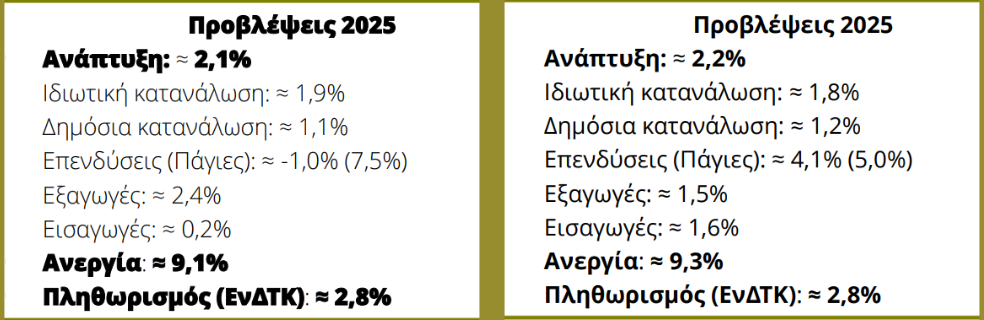 Οι προβλέψεις του ΙΟΒΕ τον Οκτώβριο (αριστερά) και τον Ιούλιο (δεξιά) του 2025. Πηγή: ΙΟΒΕ.