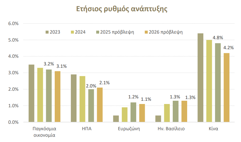 Συγκριτικά, η παγκόσμια οικονομία θα αναπτυχθεί με υψηλότερο ρυθμό 3,2% έναντι 2,9% για το 2025 και 3,1% έναντι 2,9% για το 2026. Βελτιωμένες είναι οι εκτιμήσεις για τις ΗΠΑ, με ανάπτυξη 2% αντί για 1,6% φέτος και 2,1% αντί για 1,5% το επόμενο έτος. Στην Κίνα προβλέπεται οριακή βελτίωση το 2025, από 4,7% σε 4,8%, αλλά εξίσου οριακή υποβάθμιση το 2026, από 4,3% σε 4,2%. Ελαφριά βελτίωση παρουσιάζει η Ευρωζώνη, με ανάπτυξη 1,2% έναντι 1% για το 2025, παρόλο που για το 2026 εκτιμάται επιβράδυνση στο 1,1% έναντι 1,2%. Η Ευρώπη συνεχίζει να αντιμετωπίζει ορισμένα χρόνια προβλήματα, όπως η χαμηλή ανταγωνιστικότητα και η απουσία καινοτομίας συγκριτικά με τις ΗΠΑ και την Κίνα. Επιπροσθέτως, οι αυξημένες αμυντικές δαπάνες θα λειτουργήσουν πιεστικά στο ήδη στενό δημοσιονομικό περιθώριο.