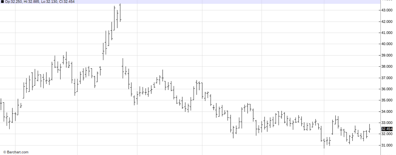 (Διακύμανση τιμών φυσικού αερίου στην πλατφόρμα, TTF, τελευταίων έξι μηνών. Πηγή: Barchart.com)