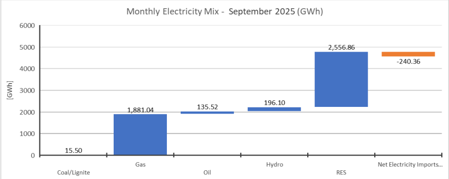 (Διάγραμμα μηνιαίου μείγματος καυσίμων στην ηλεκτροπαραγωγή για τον μήνα Σεπτέμβριο 2025. Πηγή: ΙΕΝΕ)