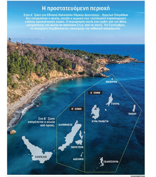 Ο γενικός γραμματέας Περιβάλλοντος Πέτρος Βαρελίδης εξέδωσε απόφαση με την οποία ορίζει ότι η αλιεία με συρόμενα εργαλεία απαγορεύεται στο σύνολο του θαλασσίου πάρκου. Οπως αναφέρει, η ειδική περιβαλλοντική μελέτη (που εκπονήθηκε από ειδικούς επιστήμονες για την περιοχή) περιλαμβάνει και τη σχετική απαγόρευση. Και εφόσον η μελέτη έχει εγκριθεί από το ΥΠΕΝ, θεωρείται ότι έχει τεθεί σε ισχύ, παρότι δεν έχει ολοκληρωθεί ακόμη η διαδικασία κύρωσης (με προεδρικό διάταγμα). Την ίδια ημέρα εξέδωσαν αποφάσεις και ο ΟΦΥΠΕΚΑ και το Λιμεναρχείο Σκιάθου, επαναλαμβάνοντας την απαγόρευση.