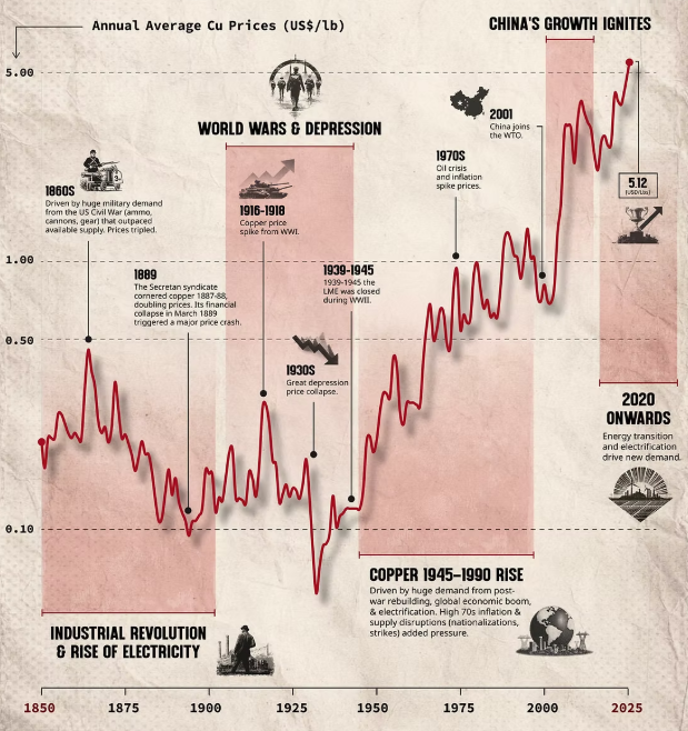 Η ιστορική εξέλιξη των τιμών του χαλκού. Πηγή: MiningVisuals.