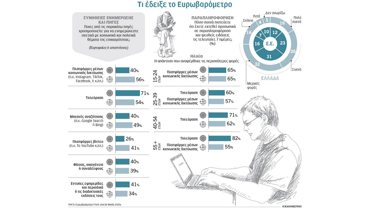 Στην Ελλάδα, το 56% των συμμετεχόντων στη διαδικτυακή δημοσκόπηση απάντησε ότι για θέματα της επικαιρότητας προτιμά να ενημερώνεται από social media πλατφόρμες, με τον μέσο όρο στην Ευρωπαϊκή Ενωση να είναι στο 40%. Για περισσότερους από επτά στους δέκα Ευρωπαίους, βασική πηγή ενημέρωσης παραμένει η τηλεόραση, μέσο που στην Ελλάδα κατέλαβε τη δεύτερη θέση, καθώς 54% των ερωτηθέντων στη χώρα μας την ξεχώρισε ως προτιμότερη πηγή ενημέρωσης. Μόλις το 34% των Ελλήνων –και 41% των Ευρωπαίων– ενημερώνεται από εφημερίδες, περιοδικά και τις διαδικτυακές τους ιστοσελίδες.