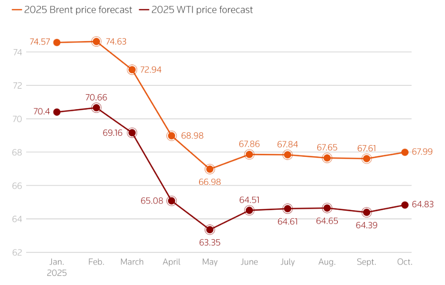 Πιο συγκεκριμένα, η εκτίμηση για το Brent αυξάνεται από τα 67,61 δολάρια ανά βαρέλι τον Σεπτέμβριο στα 67,99 δολάρια τον Οκτώβριο, ενώ για το WTI από τα 64,39 δολάρια στα 64,83. Συνολικά, οι μέσες τιμές του 2025 είναι 69,27 δολάρια για το Brent και 65,92 δολάρια για το WTI. Αξίζει να σημειωθεί πως οι τιμές για το αμερικανικό πετρέλαιο είναι ελαφρώς κάτω από τα 65 δολάρια που απαιτούνται για την αντιστάθμιση του κόστους στα σχιστολιθικά πηγάδια που αποτελούν τη συντριπτική πλειοψηφία της χερσαίας παραγωγής, αλλά πάνω από το ψυχολογικό όριο των 60 δολαρίων.