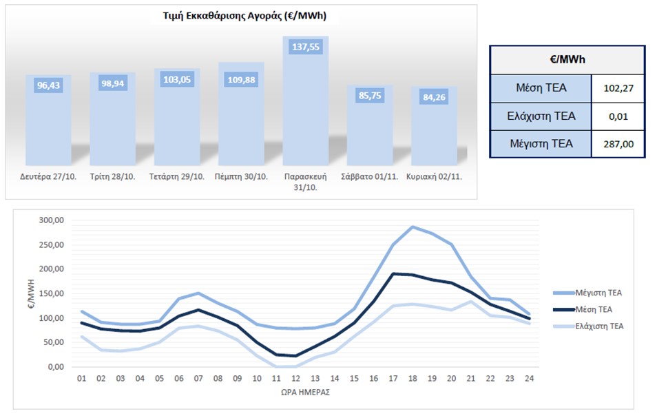 στα €102,27/MWh, δηλαδή μειωμένη σε ποσοστιαία βάση κατά 8,91% από τη μέση ΤΕΑ της αμέσως προηγούμενης εβδομάδας, με τη μέγιστη και την ελάχιστη ΤΕΑ να διαμορφώνονται στα €287,00/MWh και στα €0,01/MWh αντιστοίχως. Αξίζει να αναφερθεί ότι η μεγαλύτερη μέση ΤΕΑ ανά ημέρα της προηγούμενης εβδομάδας επετεύχθη την περασμένη Παρασκευή (31/10) φτάνοντας τα €137,55/MWh.