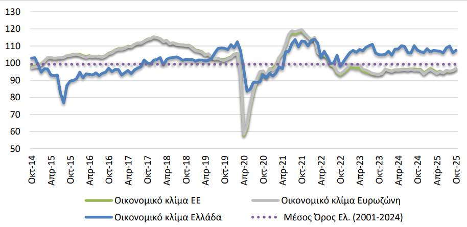 Εντελώς διαφορετικό κλίμα επικρατεί στην υπόλοιπη Ευρώπη. Σύμφωνα με τα στοιχεία, ο Οκτώβριος ήταν ο υψηλότερος μήνας για τον δείκτη οικονομικού κλίματος, τόσο στην Ευρωπαϊκή Ένωση με 96,7 μονάδες, όσο και στην Ευρωζώνη με 96,8 μονάδες. Η εικόνα αυτή διαμορφώθηκε χάρη στη βελτίωση των προβλέψεων σε όλους σχεδόν τους κλάδους, κάτι που αναδεικνύει το χάσμα που υπάρχει μεταξύ της Ελλάδας και των άλλων 26 κρατών-μελών. Έχει ιδιαίτερο ενδιαφέρον το γεγονός πως οι συνεχιζόμενες εντάσεις στο διεθνές εμπόριο, αλλά και οι εντεινόμενες ανησυχίες για την οικονομική ευρωστία των ευρωπαϊκών δημοσιονομικών δεν φαίνονται να επηρεάζουν τα αισθήματα των ανθρώπων της αγοράς και των καταναλωτών στην ΕΕ.