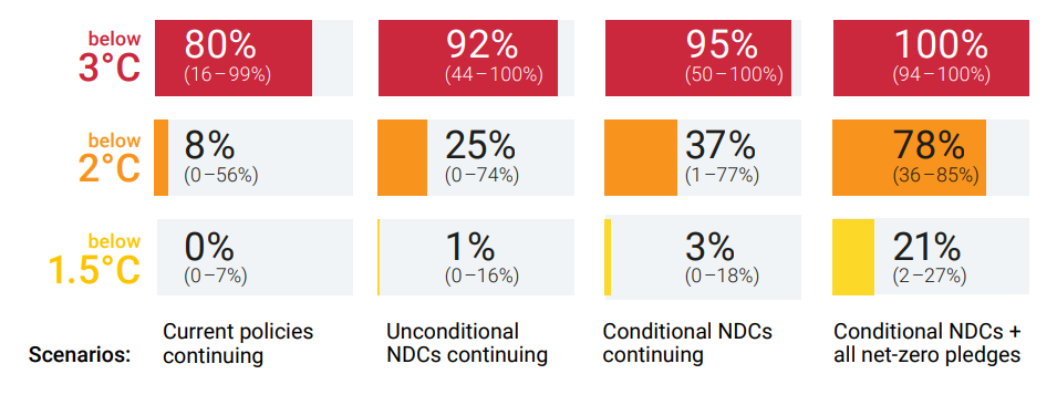 Με βάση τις προβλέψεις, η υπέρβαση του 1,5°C θεωρείται αναπόφευκτη, τουλάχιστον προσωρινά. Αν οι κυβερνήσεις υλοποιήσουν τα υφιστάμενα σχέδιά τους για τον περιορισμό των ρύπων, η αύξηση της παγκόσμιας θερμοκρασίας θα φτάσει τους 2,3-2,5°C. Μπορεί οι διαφορές αυτές να μοιάζουν μικρές αριθμητικά, ωστόσο οι πραγματικές συνέπειές τους είναι καταστροφικές. Για παράδειγμα, η άνοδος κατά 1,5°C θα οδηγούσε στον θάνατο το 70% των κοραλλιογενών υφάλων, ενώ κατά 2°C το 99% των οικοσυστημάτων αυτών. Αν οι κυβερνήσεις διατηρήσουν τις σημερινές πολιτικές τους, η υπερθέρμανση θα αγγίξει τους 2,8°C. Σε κάθε περίπτωση, ο ανθρώπινος πληθυσμός θα υποστεί σοβαρές επιπτώσεις.