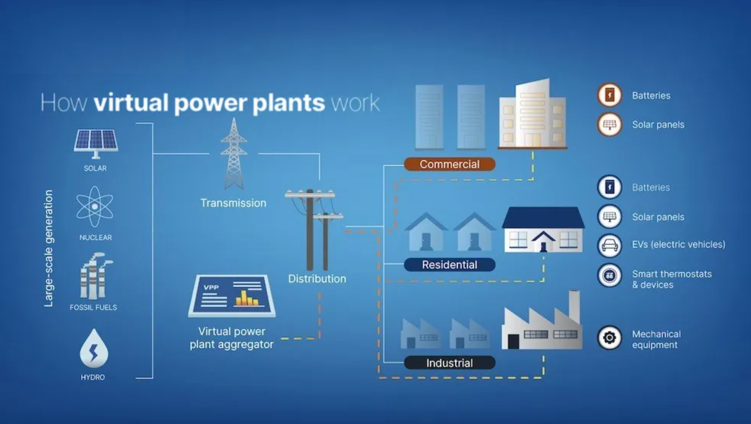 Οι VPPs ενώνουν ένα αποκεντρωμένο δίκτυο μικρότερων μονάδων παραγωγής ενέργειας— μεταξύ αυτών οικιακά φωτοβολταϊκά, μικρές μπαταρίες, φορτιστές οχημάτων, και άλλες “έξυπνες” συσκευές— η χρήση των οποίων ρυθμίζεται από έναν κεντρικό σταθμό προκειμένου να εξισορροπήσουν το δίκτυο στις ώρες αιχμής. Μολονότι αποτελούν μία σχετικά πρόσφατη εξέλιξη για την εποχή της ενεργειακής μετάβασης, οι VPPs έχουν αποκτήσει πολλούς υποστηρικτές καθώς αποτελούν μία πολύ ταχύτερη και φθηνότερη λύση συγκριτικά με τις μεγάλες μονάδες ΑΠΕ και τα βιομηχανικά συστήματα αποθήκευσης.