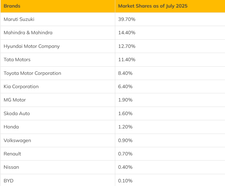 Τα μερίδια των αυτοκινητοβιομηχανιών στην ινδική αγορά. Πηγή: Go Digit.