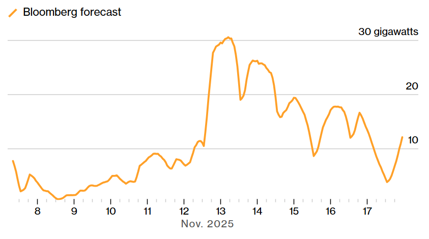 Οι προβλέψεις του Bloomberg για την παραγωγή αιολικής ενέργειας στη Γερμανία. Πηγή: Bloomberg.