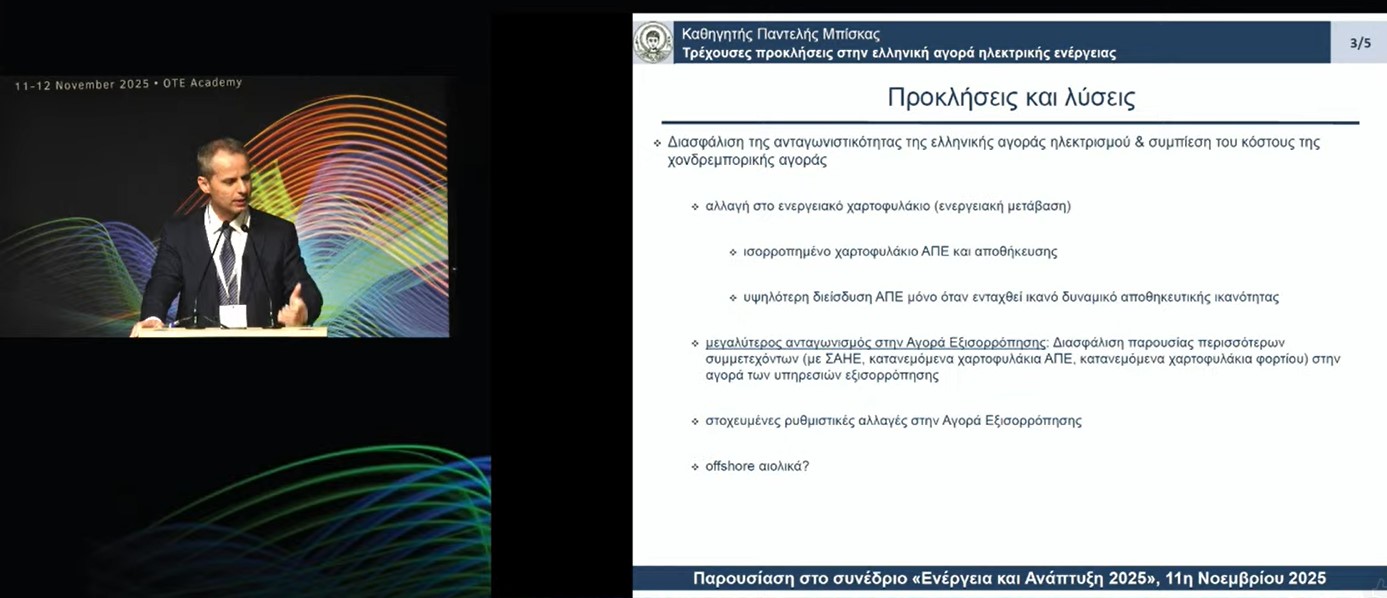 Προς τούτο, υποστήριξε, πρέπει να διασφαλιστεί η παρουσία περισσότερων συμμετεχόντων, με ΣΑΗΕ, κατανεμόμενα χαρτοφυλάκια ΑΠΕ και κατανεμόμενα χαρτοφυλάκια φορτίου, στην αγορά των υπηρεσιών εξισορρόπησης, καθώς και στοχευμένες ρυθμιστικές αλλαγές στην Αγορά Εξισορρόπησης, πιθανώς και συμμετοχή των offshore αιολικών.
