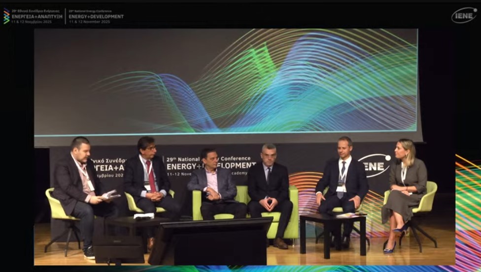 Το πάνελ της δεύτερης συνεδρίας (από αριστερά): Χάρης Φλουδόπουλος, δημοσιογράφος Capital.gr & Κεφάλαιο (συντονιστής), Δημήτρης Φούρλαρης (Αντιπρόεδρος Κλάδου Ενέργειας, ΡΑΑΕΥ), Κωνσταντίνος Νάζος (αν. Διευθύνων Σύμβουλος Διαχείρισης Ενέργειας Ομίλου ΔΕΗ), Δρ. Αθανάσιος Δαγούμας (αν. Καθηγητής, Οικονομική της Ενέργειας και των Φυσικών Πόρων, Πανεπιστήμιο Πειραιώς - τ. Πρόεδρος ΡΑAΕY), Δρ. Παντελής Μπίσκας (Καθηγητής, Τμήμα Ηλεκτρολόγων Μηχανικών & Μηχανικών Υπολογιστών, ΑΠΘ - Πρόεδρος Επιστημονικού Συμβουλίου ΙΕΝΕ), Δρ. Φαίη Μακαντάση (Διευθύντρια Ερευνών, διαΝΕΟσις).