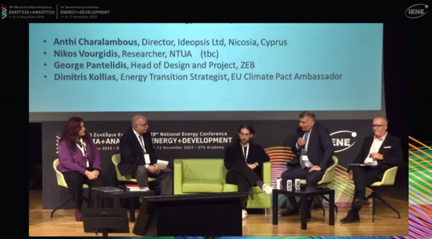 Το πάνελ της 8ης συνεδρίας (από αριστερά): Η κ. Ανθή Χαραλάμπους (Διευθύντρια, Ideopsis), ο συντονιστής του πάνελ κ. Κωνσταντίνος Θεοφύλακτος (Αντιπρόεδρος IENE, Πρόεδρος Επιτροπής Ενεργειακής Αποδοτικότητας ΙΕΝΕ), ο κ. Νίκος Βουργίδης (Ηλεκτρολόγος Μηχανικός, Ερευνητής ΕΜΠ) , ο κ. Γιώργος Παντελίδης (Ενεργειακός Ελεγκτής, Υπεύθυνος Μελετών & Έργων, ΖΕΒ ΑΕΕΥ) και ο κ. Δημήτρης Κόλλιας (Σύμβουλος Ενεργειακής Μετάβασης)