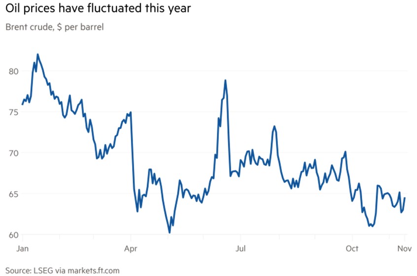 Το αργό Brent άγγιξε τα 82,63 δολάρια το βαρέλι τον Ιανουάριο πριν ξαναρχίσει την πτωτική του τάση, και στη συνέχεια αυξήθηκε ξανά τον Ιούνιο μετά την έξαρση των εντάσεων στη Μέση Ανατολή. Ο δείκτης αναφοράς διαπραγματευόταν στα περίπου 64 δολάρια το βαρέλι την Παρασκευή.
