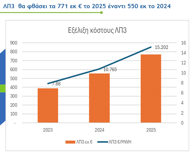 Η εξέλιξη του κόστους του ΛΠ3 {λογαριασμού προσαυξήσεων 3) την περίοδο 2023-2025 - πηγή: παρουσίαση κ. Α. Κοντολέοντος στο 29ο Συνέδριο «Ενέργεια και Ανάπτυξη» του ΙΕΝΕ