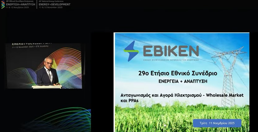 Ο πρόεδρος της Ένωσης Βιομηχανικών Καταναλωτών Ενέργειας κ. Αντώνης Κοντολέων, στις 11 Νοεμβρίου 2025, στο βήμα του 29ου Εθνικού Συνεδρίου «Ενέργεια και Ανάπτυξη» του Ινστιτούτου Ενέργειας ΝΑ Ευρώπης