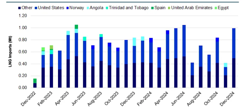 (Γερμανικές εισαγωγές LNG ανά χώρα προέλευσης, Δεκέμβριος 2022- Δεκέμβριος 2024. Πηγή: NGI)