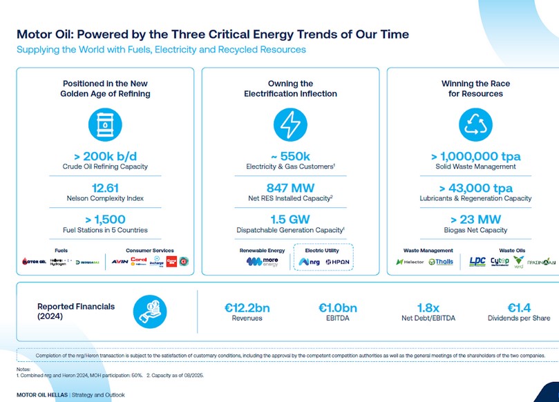Με σταθερότητα, καινοτομία και μακροπρόθεσμο όραμα, ο Όμιλος Motor Oil έχει μεταμορφωθεί σε έναν περιφερειακό διαφοροποιημένο ενεργειακό ηγέτη - συνδυάζοντας τις ισχυρές επιδόσεις στον τομέα των υγρών καυσίμων με την ταχεία ανάπτυξη στους κλάδους του ηλεκτρισμού και της κυκλικής οικονομίας.