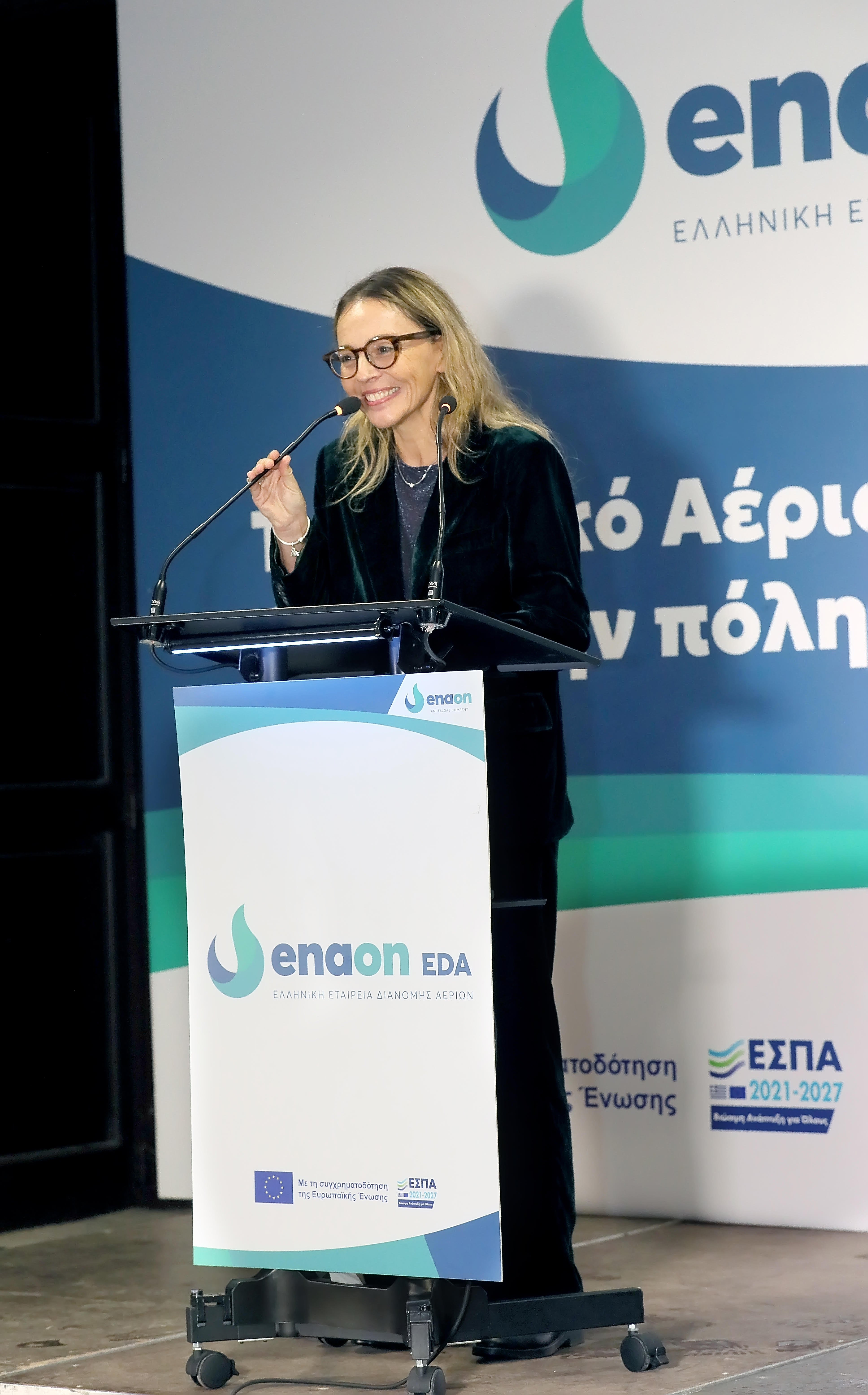 Η Διευθύνουσα Σύμβουλος της Enaon, κα Barbara Morgante μετέφερε στον χαιρετισμό της την ικανοποίησή της για το γεγονός ότι το φυσικό αέριο έφτασε πλέον και στην Καστοριά, σύμφωνα με τον στρατηγικό σχεδιασμό της εταιρείας, συμβάλλοντας σημαντικά στην ενεργειακή αναβάθμιση μιας περιοχής με ιδιαίτερα αυξημένες ενεργειακές ανάγκες.