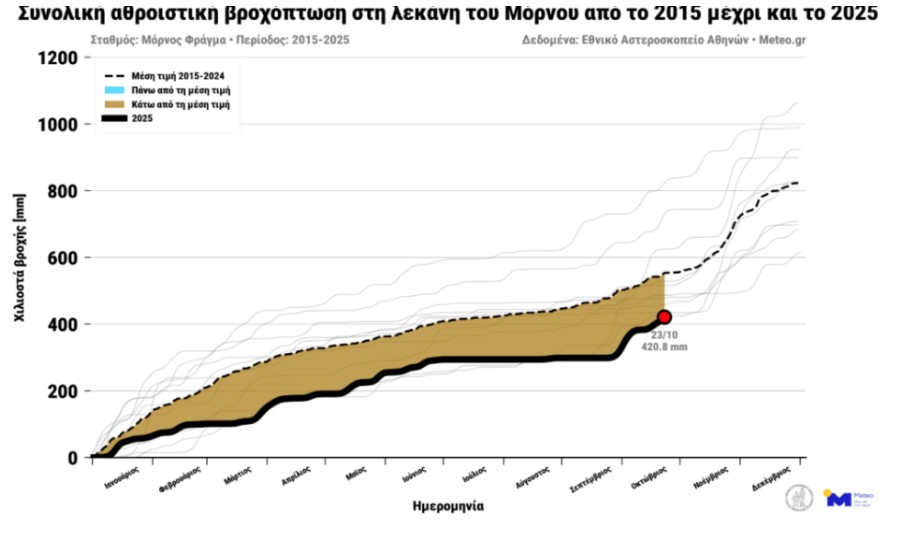 Σήμα κινδύνου εκπέμπει ο Μόρνος, τα αποθέματα του οποίου βρίσκονται πλέον σε ιστορικά χαμηλά, κάτω από 400 εκατ. κυβικά. Στο φράγμα που υδρεύει την Αττική, καλύπτοντας σε νερό το 50% του πληθυσμού της επικράτειας, η στάθμη έχει υποχωρήσει σε πρωτοφανή επίπεδα.