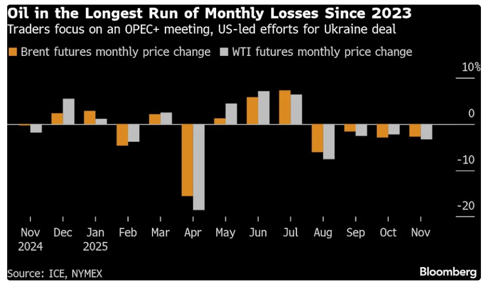 πάνω από τα 63 δολάρια το βαρέλι μετά από μια μέτρια άνοδο την Πέμπτη. Ο παγκόσμιος δείκτης αναφοράς αργούπετρελαίου βρίσκεται σε πορεία για τέταρτη συνεχόμενη μηνιαία πτώση τον Νοέμβριο, το μεγαλύτερο σερί από την περίοδο έως τον Μάιο του 2023.